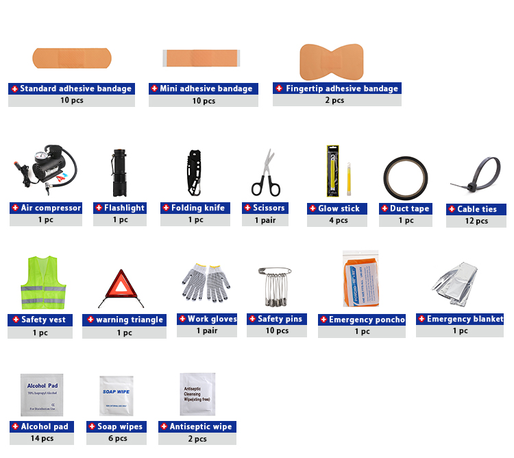 Il contient des pansements, des boules de coton de désinfection, des bandages, des ciseaux, des pinces, etc. Ces articles peuvent gérer des coupes et des abrasions mineures qui peuvent survenir sur la route.