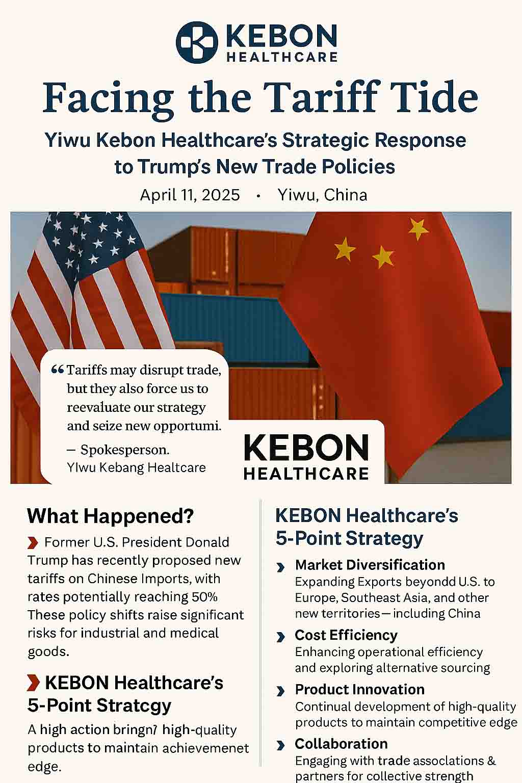 Kebang Medical considère ce défi comme un catalyseur de croissance et d'élévation de la marque. Avec une vision mondiale, des partenariats solides et une logistique flexible, la société est bien préparée à prospérer dans un environnement commercial en évolution.